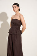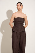 Effortlessly chic and modern, this 100% linen co-ord set features a structured strapless Corset top with adjustable side ties and wide-leg pants. Designed for comfort with a flattering silhouette, it transitions seamlessly from day brunches to elegant evenings.
