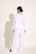 A soft linen top with contrast black piping and front tie detail. Airy, timeless, and versatile for everyday ease.